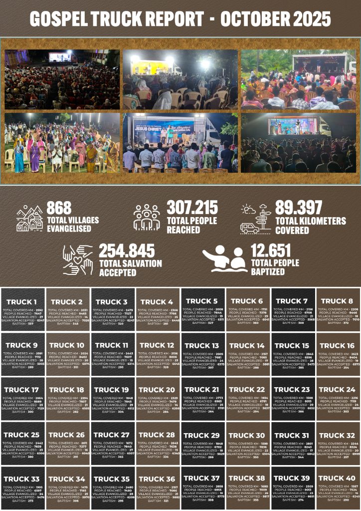 Met trots en diepe dankbaarheid presenteren we de resultaten van onze Gospel Truck missie in India voor oktober 2025. Wat een ongelooflijke maand is het geweest! Onze vloot van maar liefst 40 Gospel Trucks is onvermoeibaar door het land getrokken, en de impact is ronduit overweldigend.